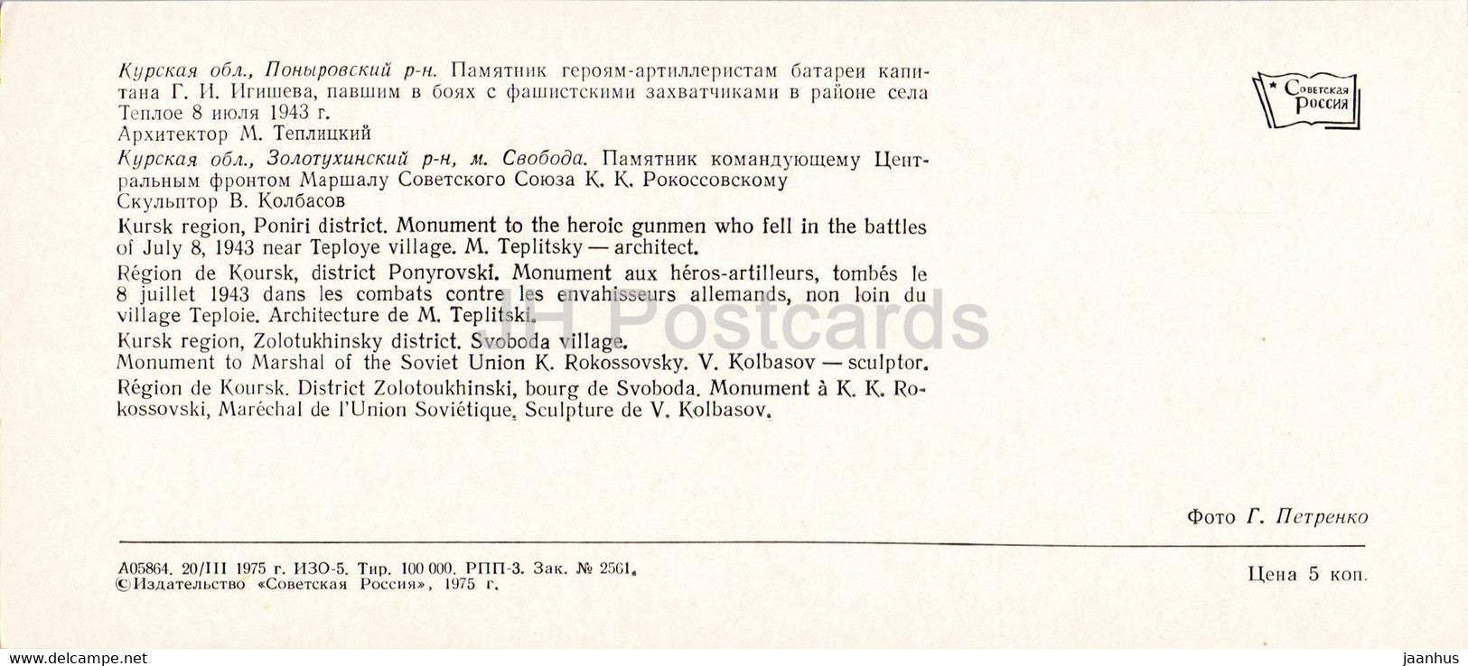 Kursk Region - monument to Rokossovsky - WWII monument - monuments to Battle of Kursk - 1975 - Russia USSR - unused