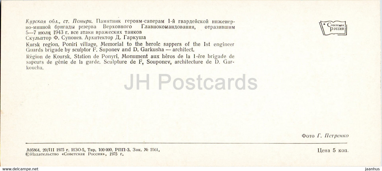 Kursk region - Poniri village - WWII monument - monuments to Battle of Kursk - 1975 - Russia USSR - unused