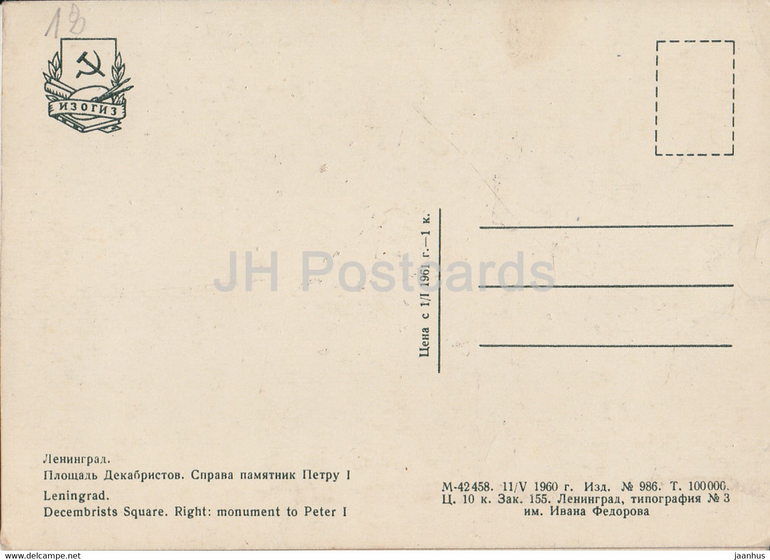 Leningrad - St Petersburg - Decembrists Square - monument to Peter I - car Volga - 1960 - Russia USSR - unused