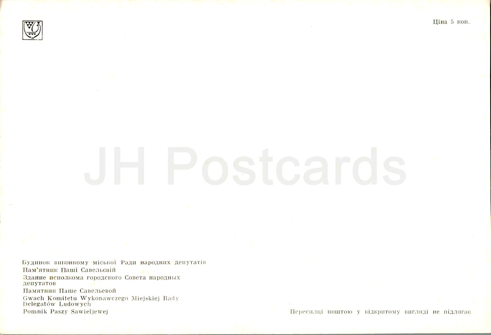 Lutsk - city council executive committee building - monument to partisan Pasha Savelieva - 1978 - Ukraine USSR - unused