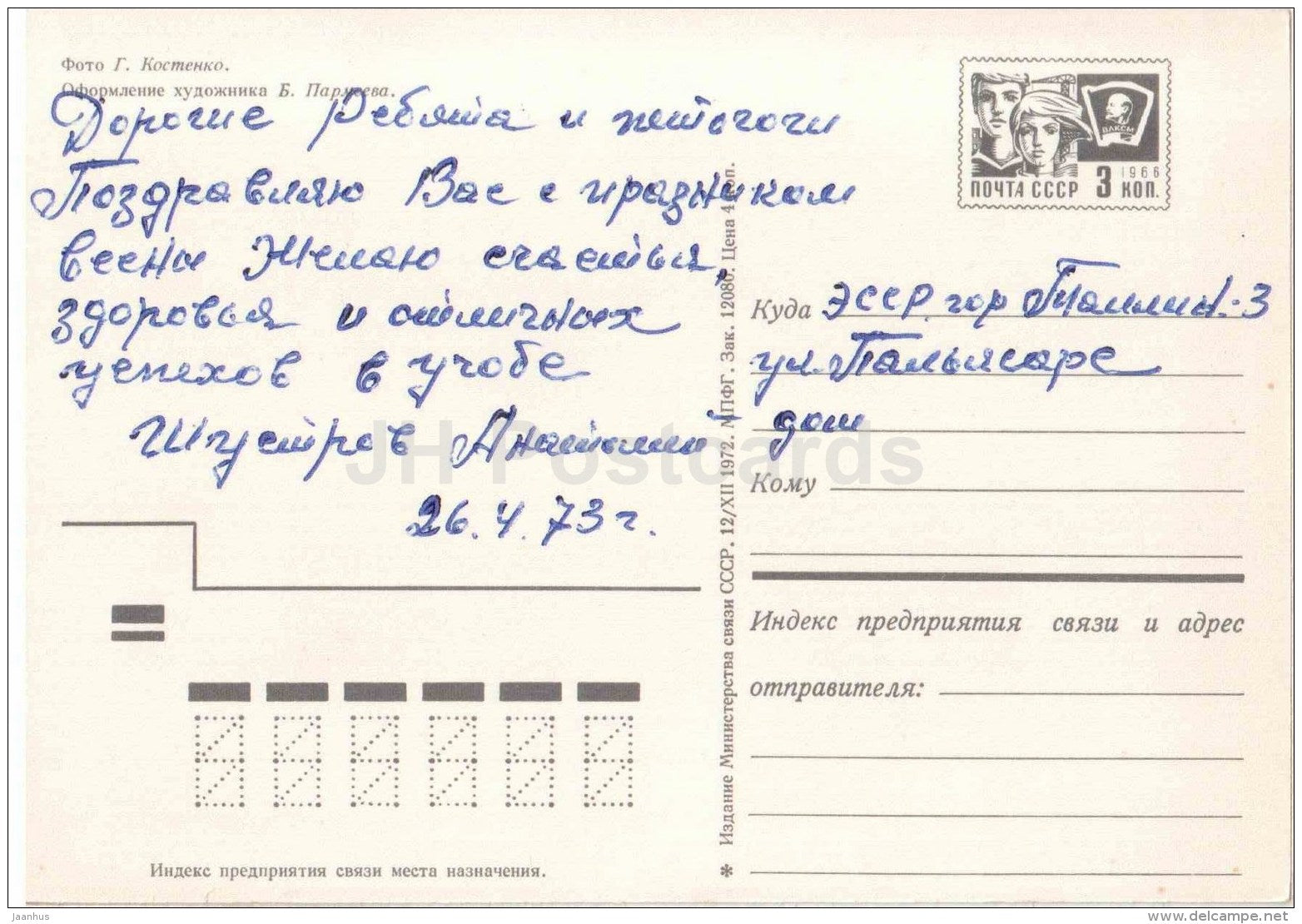 May 1 International Workers' Day greeting card - peony - flowers - hammer and sickle - 1972 - Russia USSR - used