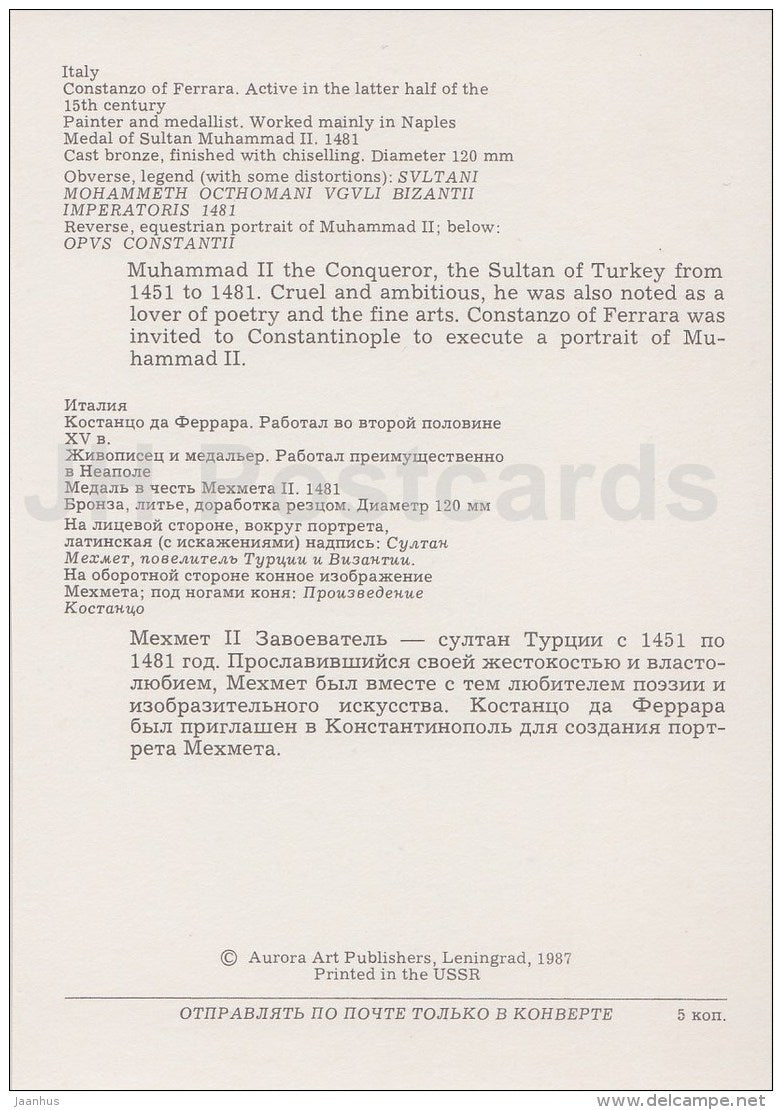 Medal of Sultan Muhammad II , 1481 . Italy - Renaissance Medals - 1987 - Russia USSR - unused