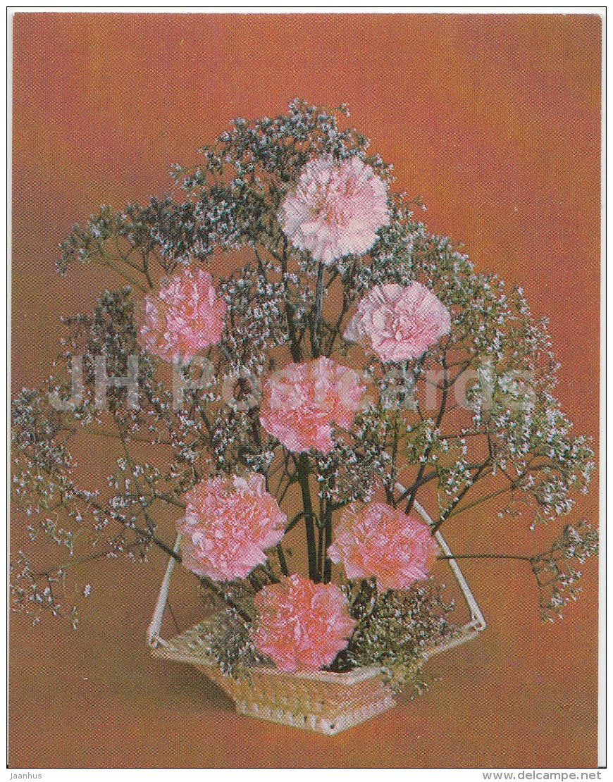 mini Birthday greeting card - pink carnation - flowers - basket - 1989 - Russia USSR - unused