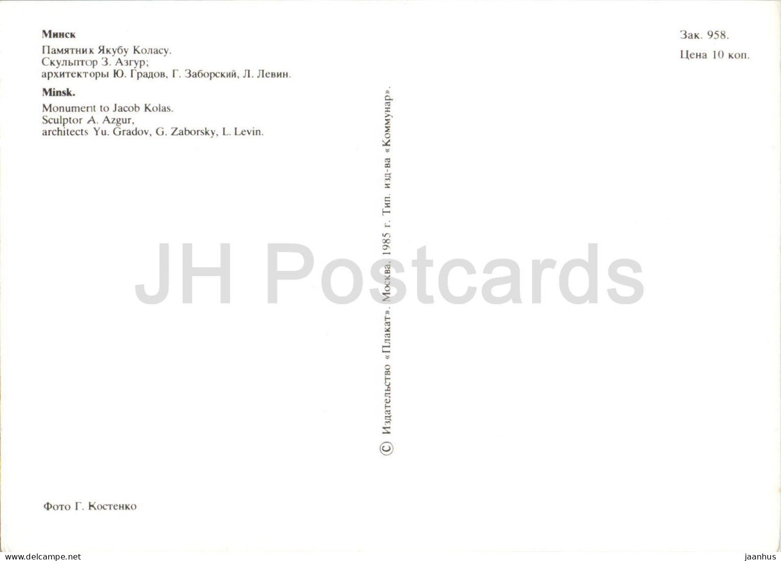 Minsk - Victory Square - Monument to Belarusian Writer Yakub Kolas - 1 - 1985 - Belarus USSR - unused