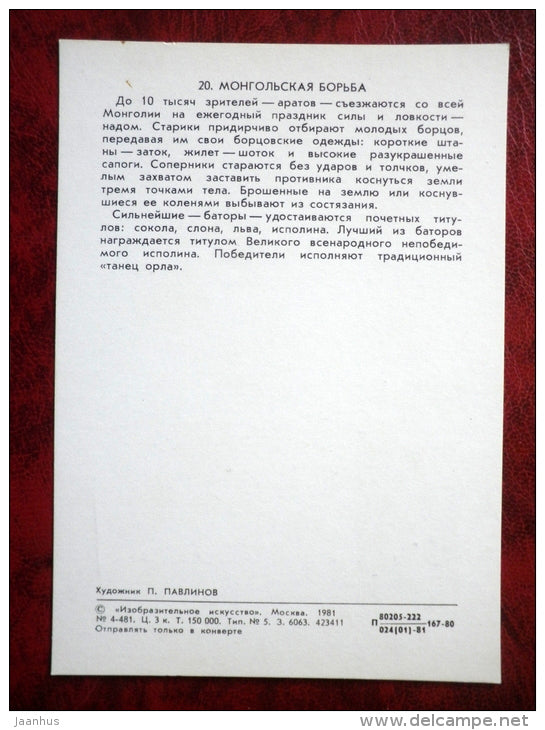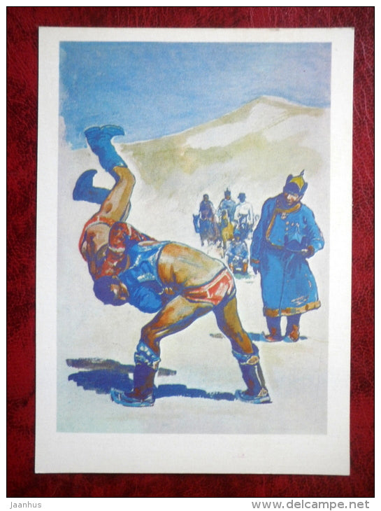 Mongolian wrestling - Illustration by P. Pavlinov - Mongolia - games - 1981 - Russia USSR - unused