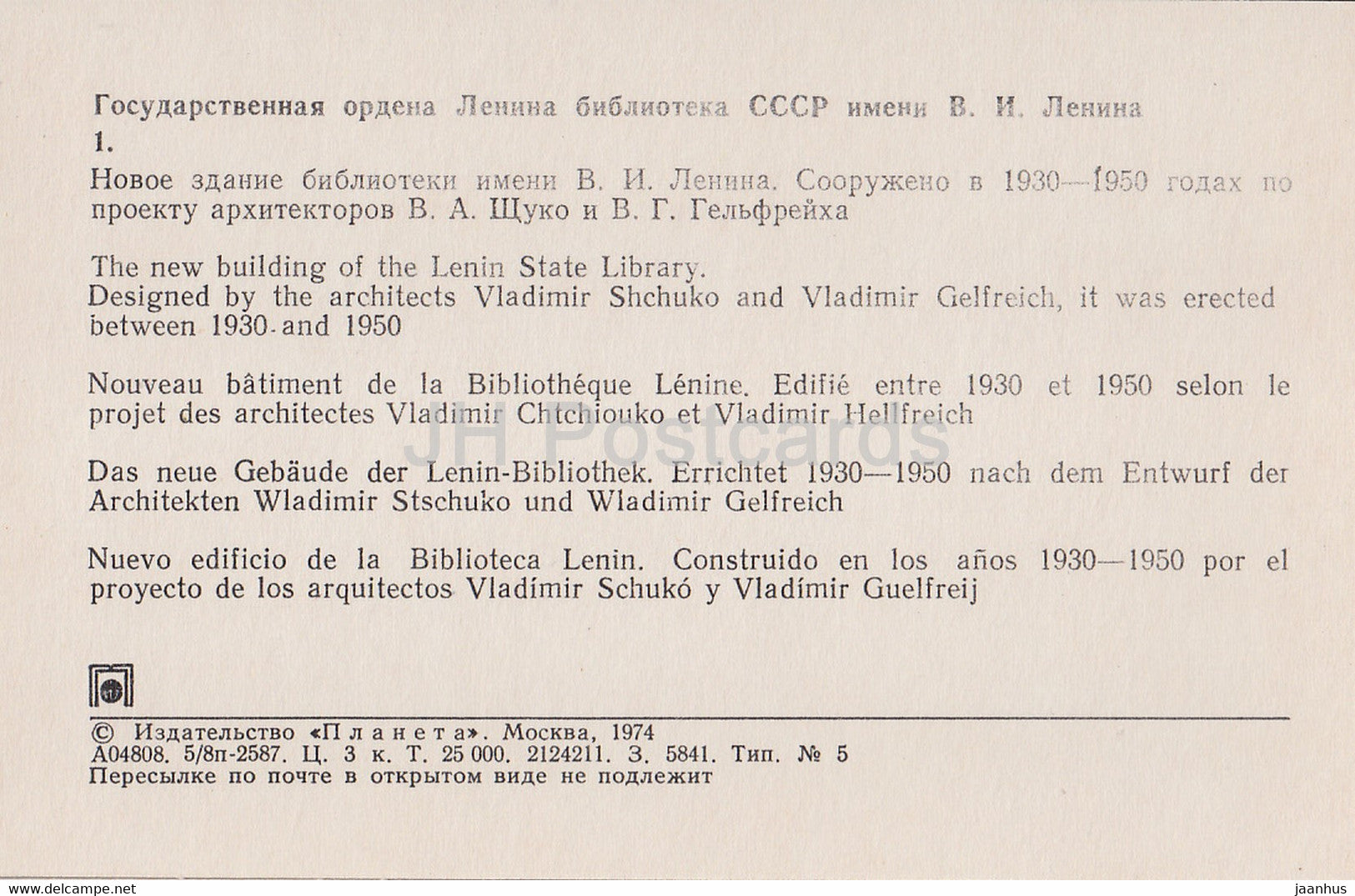 Moscow - Lenin State Library - The New Building of the Lenin State Library - 1 - 1974 - Russia USSR - unused