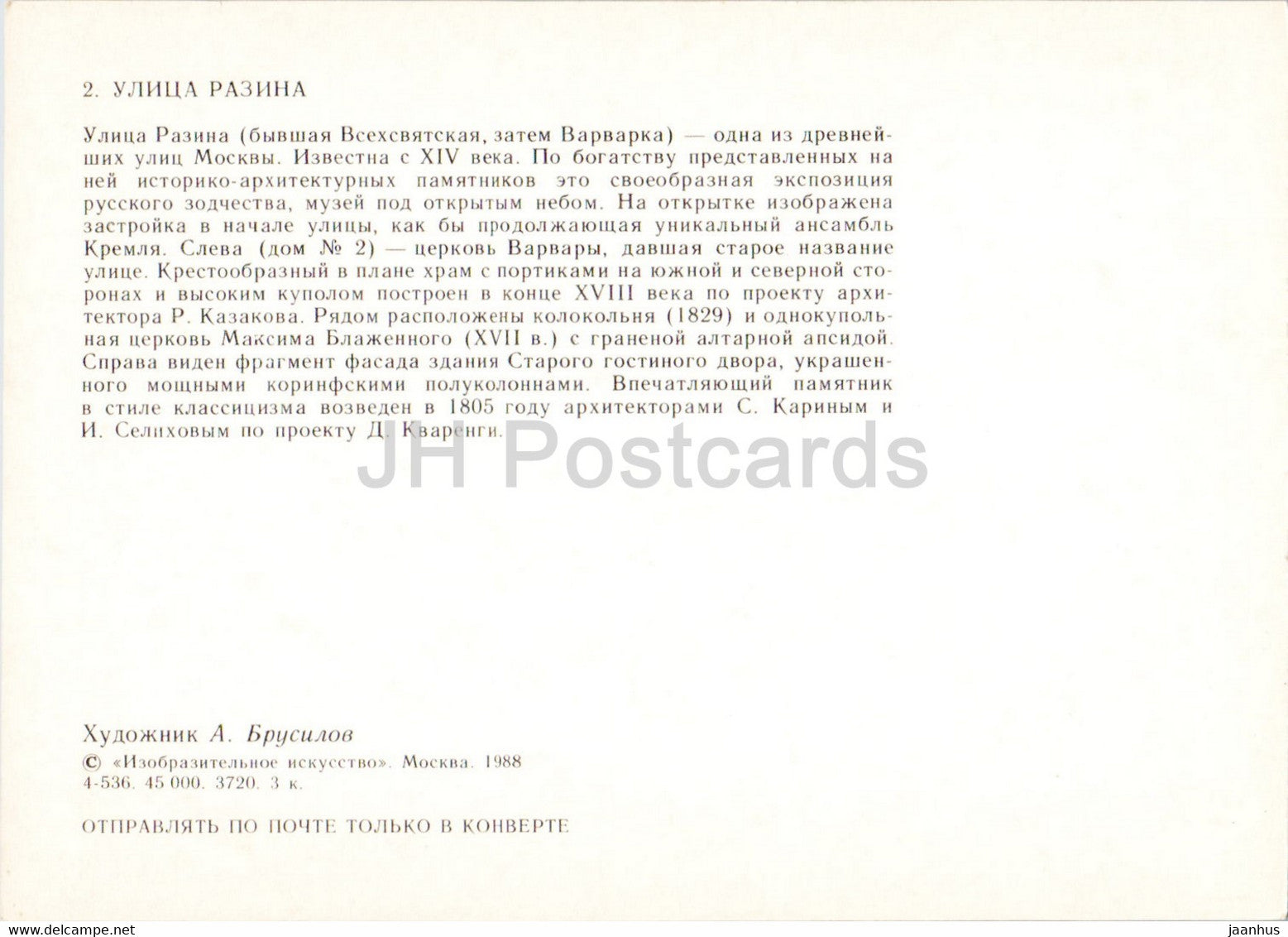 Moscow - Razin street - illustration by A. Brusilov - 1988 - Russia USSR - unused