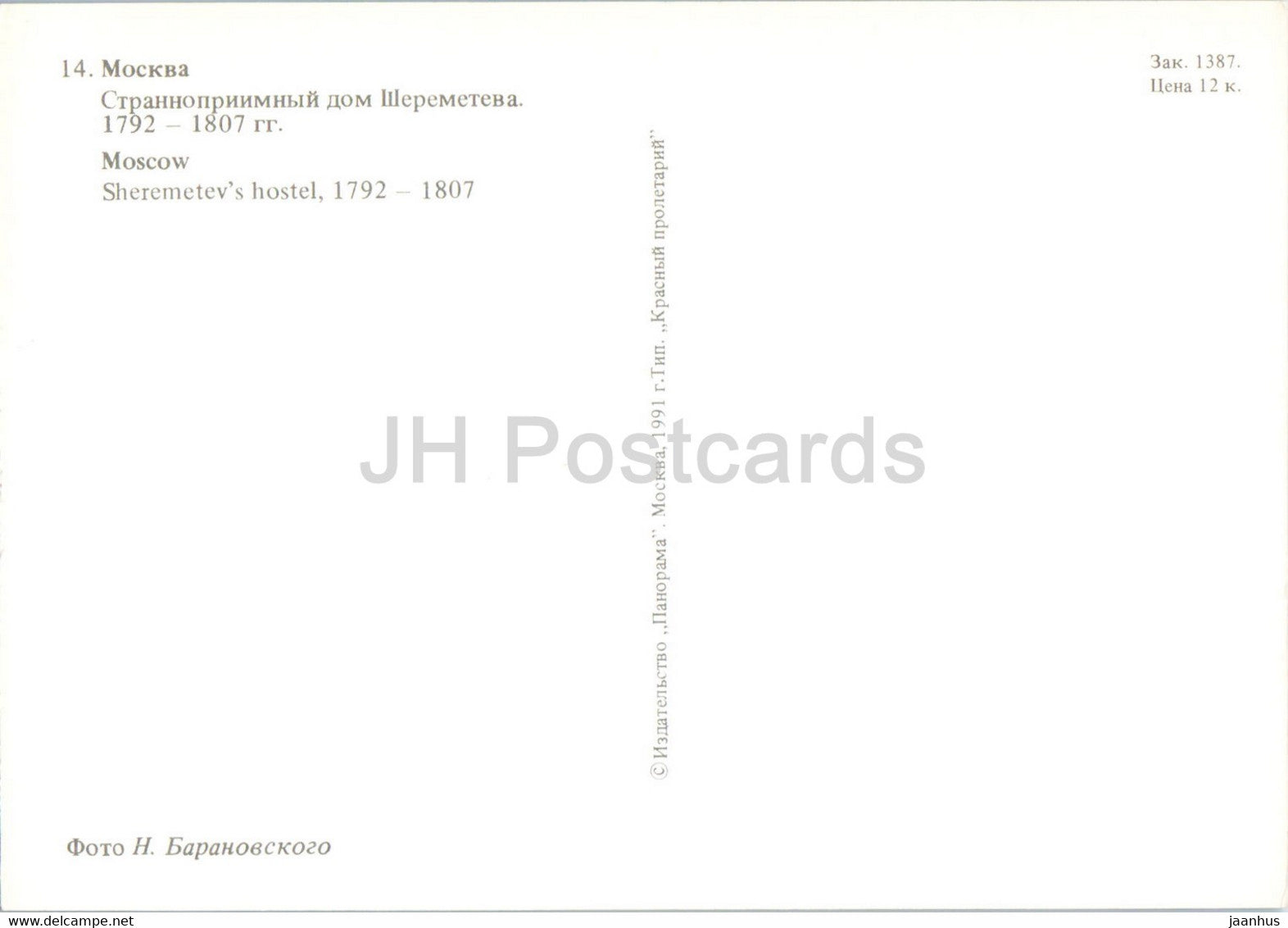 Moscow - Sheremetev's hostel - 1991 - Russia USSR - unused
