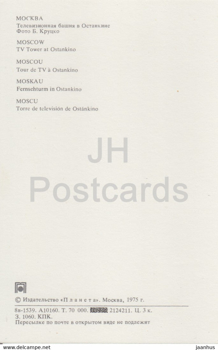 Moscow - TV Tower at Ostankino - 1975 - Russia USSR - unused