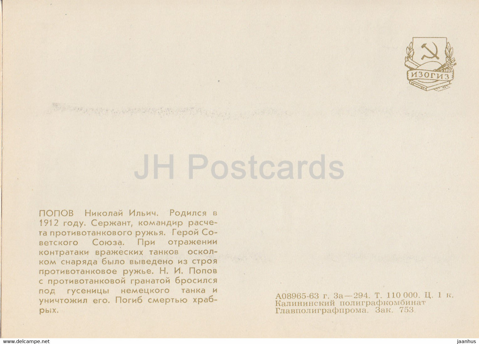 N. Popov - Soviet Heroes of WWII - tank - illustration by L. Kotlyarov - 1963 - Russia USSR - unused