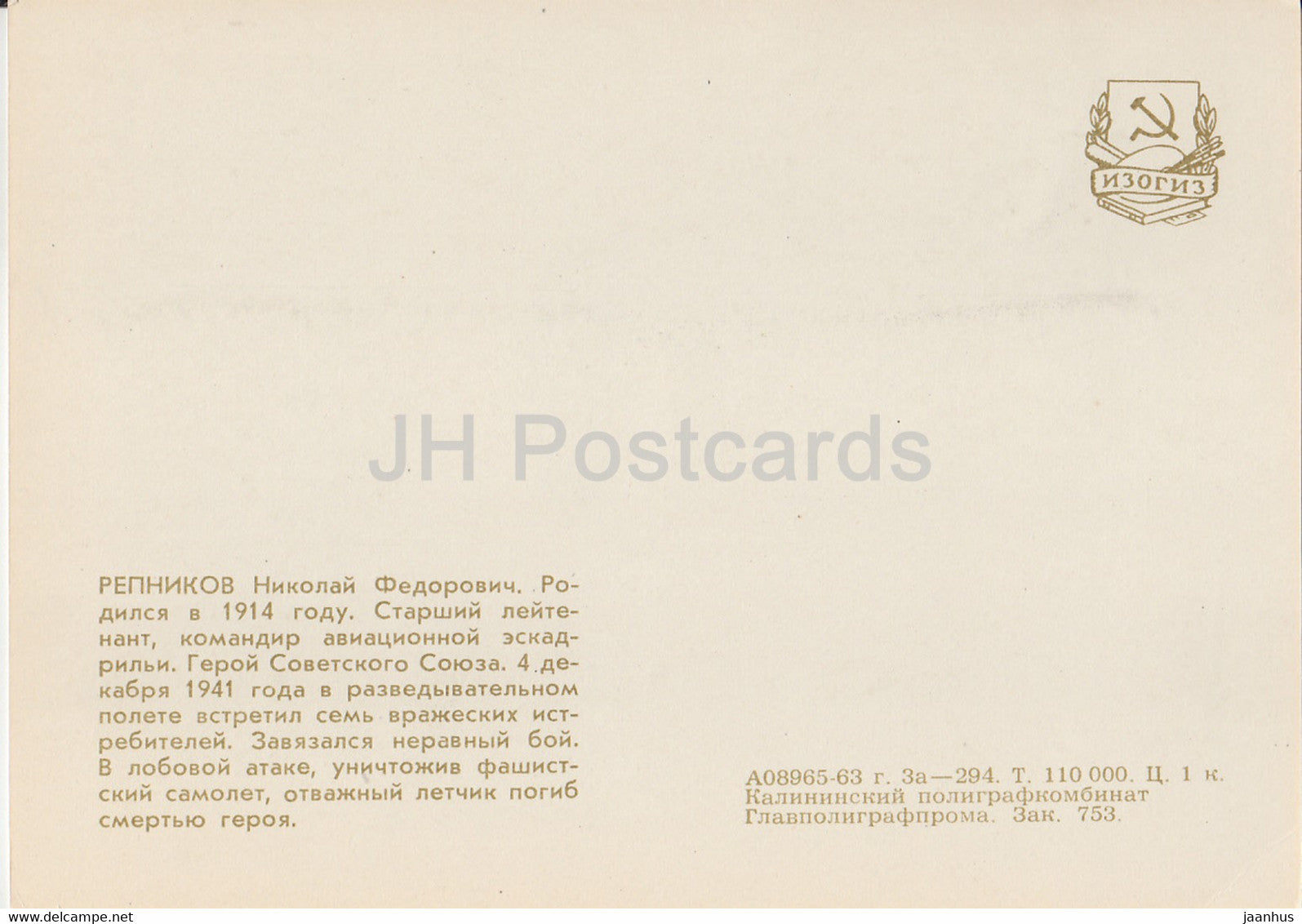 N. Repnikov - Soviet Heroes of WWII - airplane - illustration by L. Kotlyarov - 1963 - Russia USSR - unused