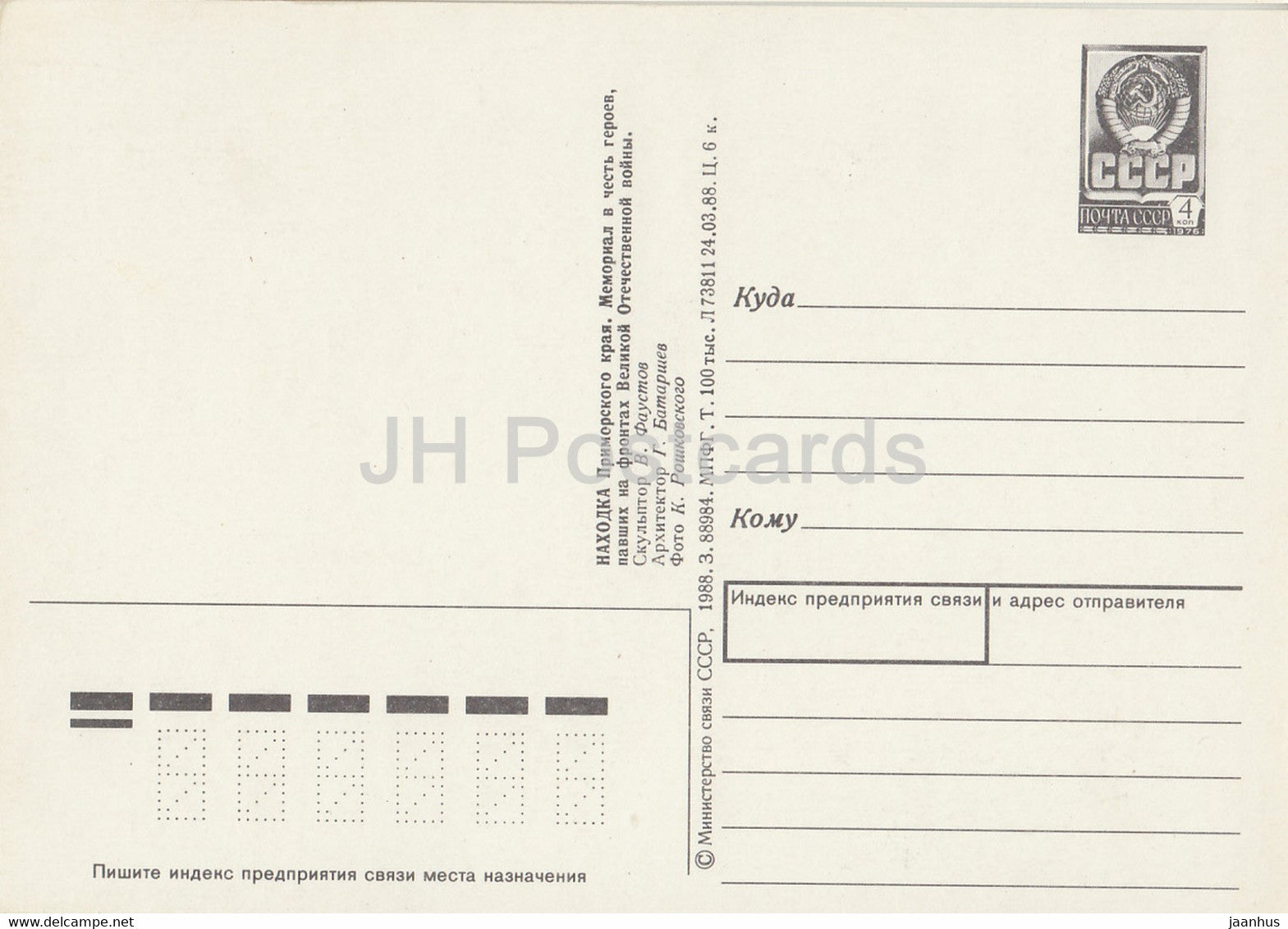 Nakhodka - Nahodka - memorial in honor of fallen heroes of WWII - postal stationery - 1988 - Russia USSR - unused