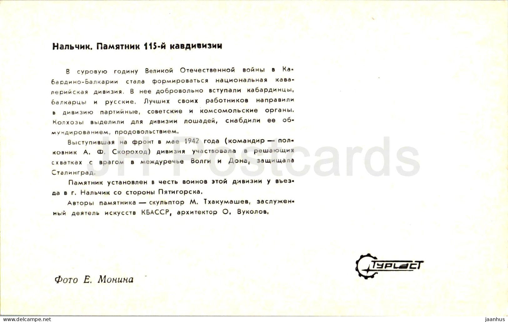 Nalchik - monument to the 115th Cavalry Division - Kabardino-Balkaria - Turist - 1973 - Russia USSR - unused