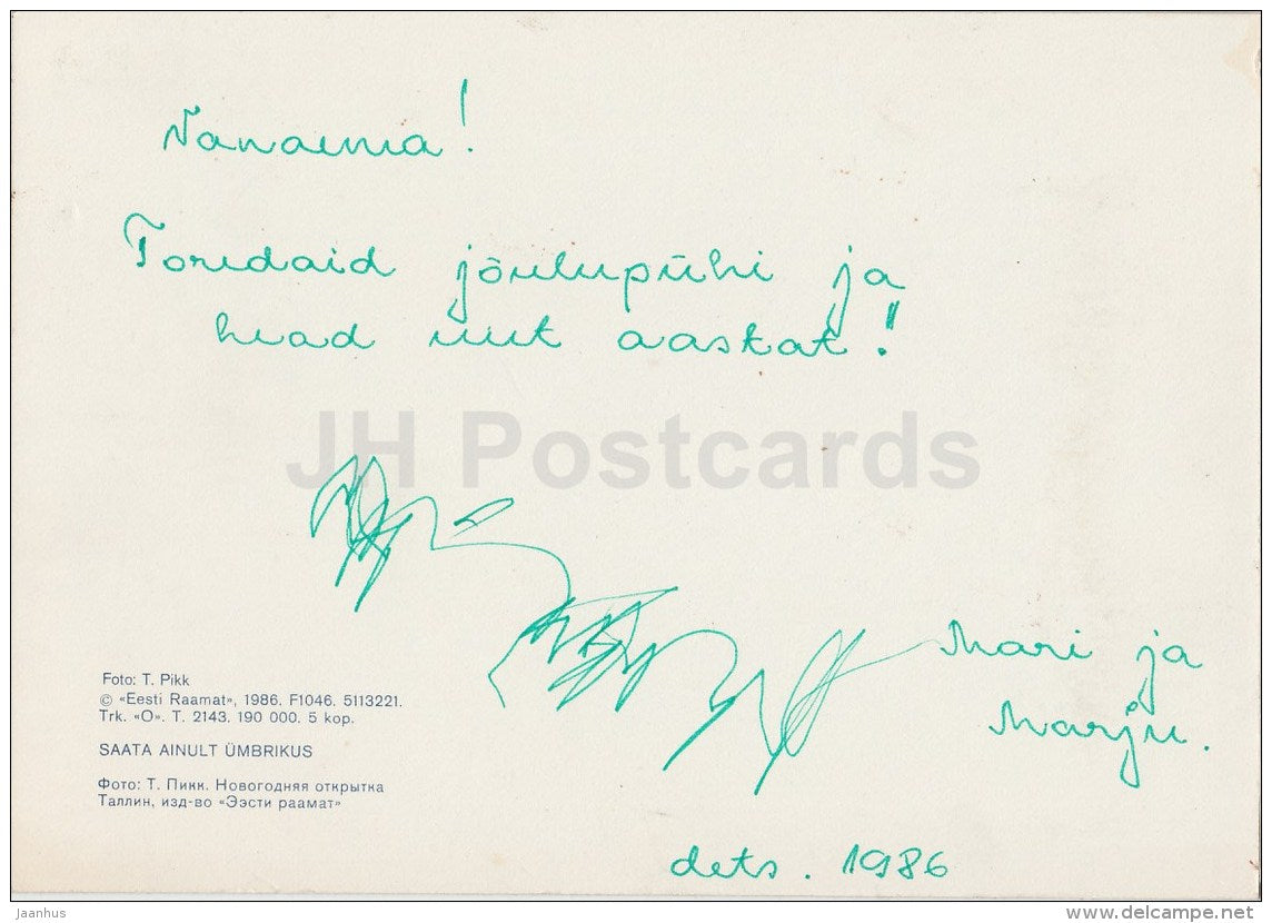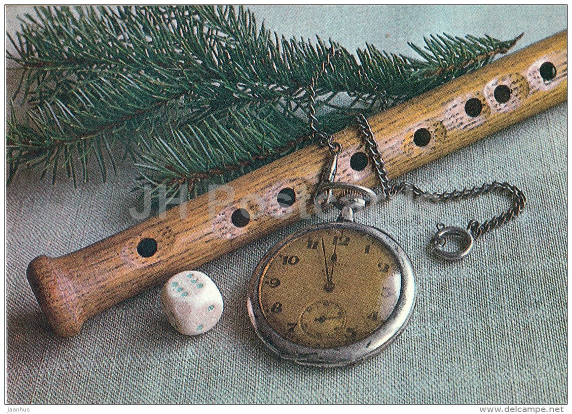 New Year Greeting card - 1 - die - watch - flute - 1986 - Estonia USSR - used