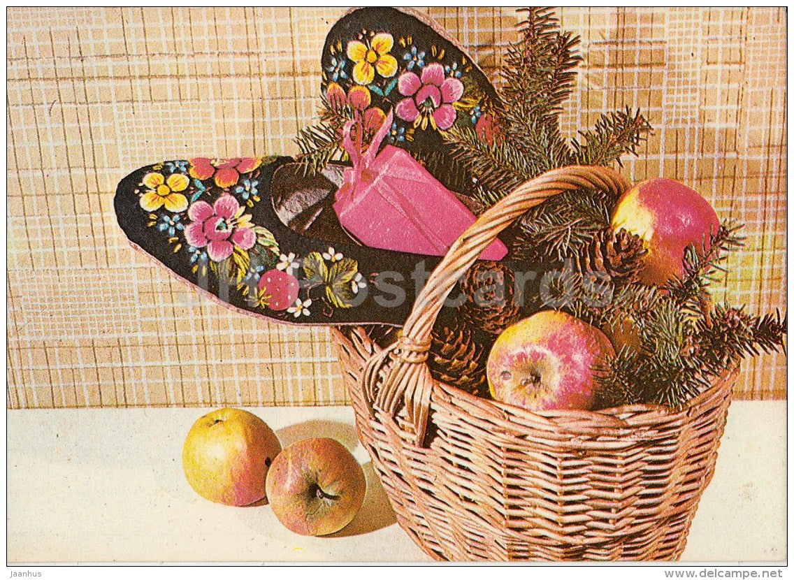 New Year Greeting card - 1 - footwear - apples - basket - 1981 - Estonia USSR - used