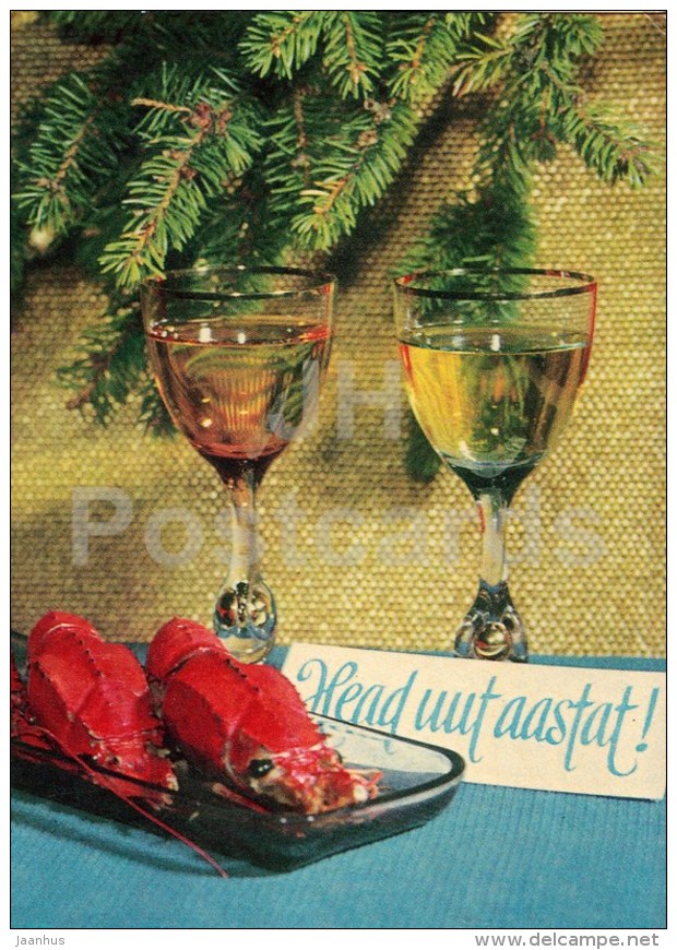 New Year Greeting card - 1 - white wine - crawfish - 1970 - Estonia USSR - used