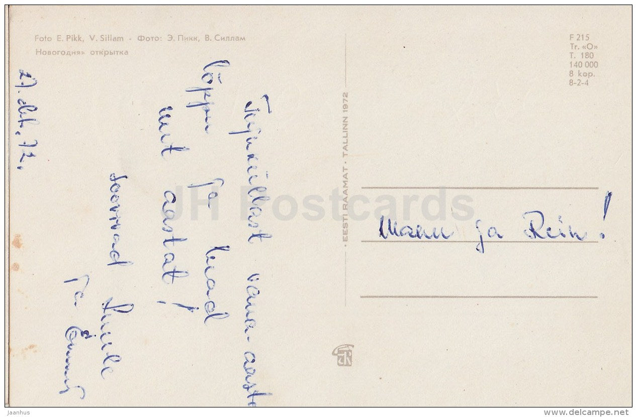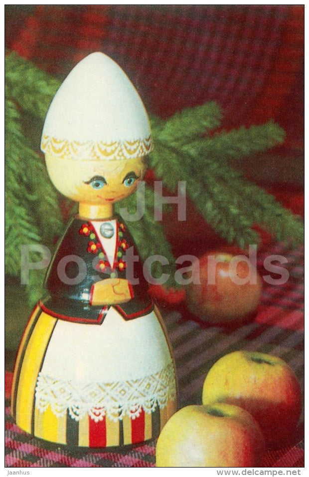 New Year Greeting card - 1 - wooden doll in estonian folk costumes - apple - 1972 - Estonia USSR - used