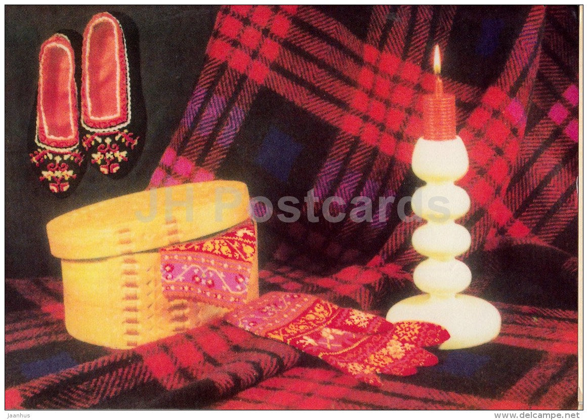 New Year greeting card - 3 - woven slippers - mittens - candle - national patterns - 1975 - Estonia USSR - used