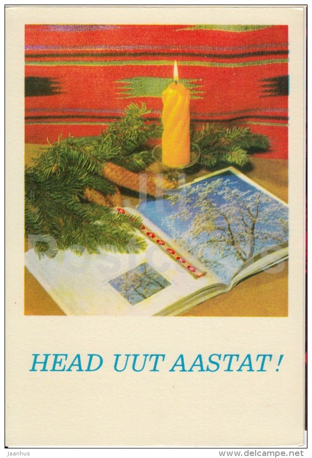 New Year Greeting card - 4 - cones - candle - book - 1974 - Estonia USSR - used