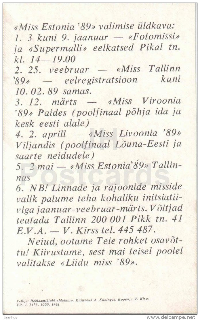 New Year Greeting card by A. Kuningas - Miss Estonia - schedule - 1988 - Estonia USSR - unused