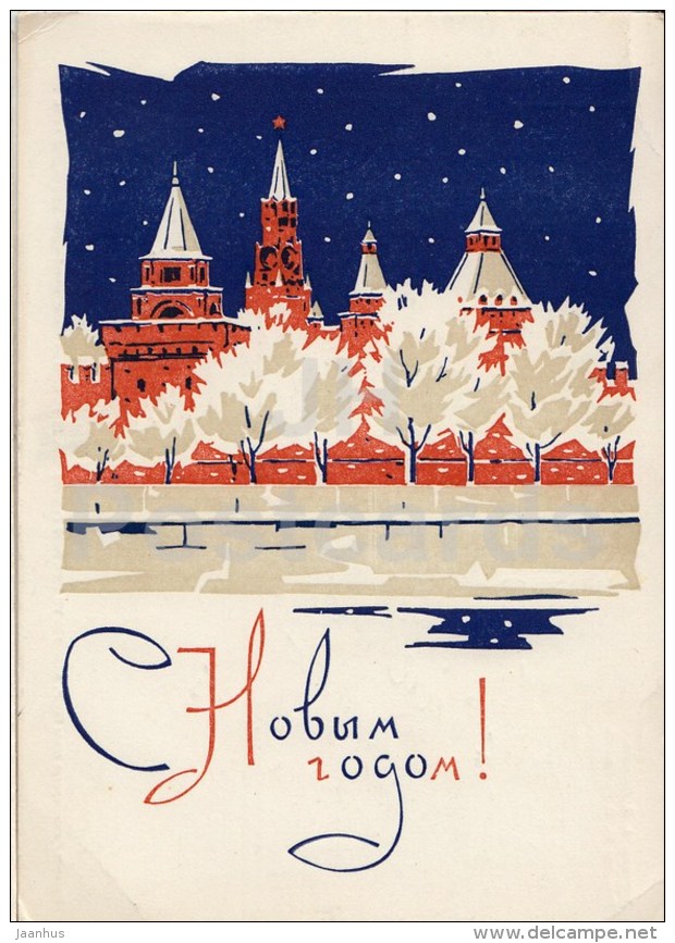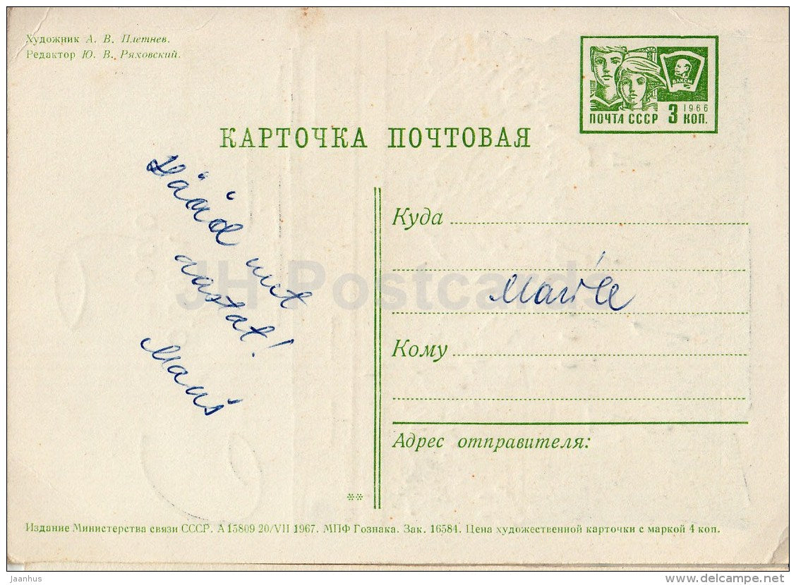 New Year greeting card by A. Pletnyev - Moscow Kremlin - illustration - postal stationery - 1967 - Russia USSR - used