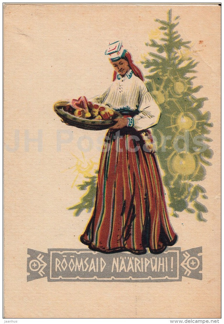 New Year Greeting Card by A. Vender - woman in folk costume - 1959 - Estonia USSR - used