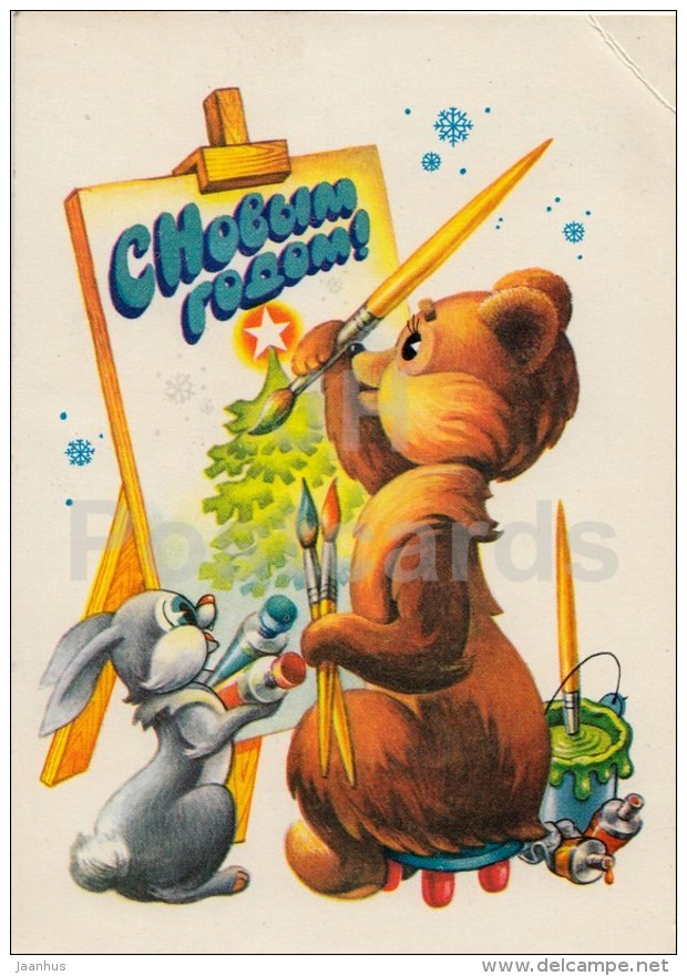 New Year greeting card by A. Zhrebin - hare - bear - painting - postal stationery - 1980 - Russia USSR - used