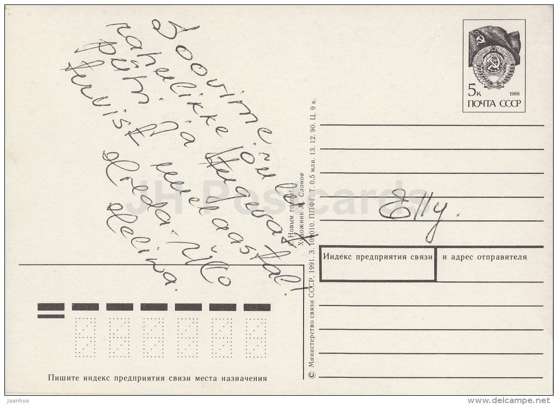 New Year greeting card by I. Slonov - 3 - lantern - fit tree - postal stationery - 1991 - Estonia USSR - used