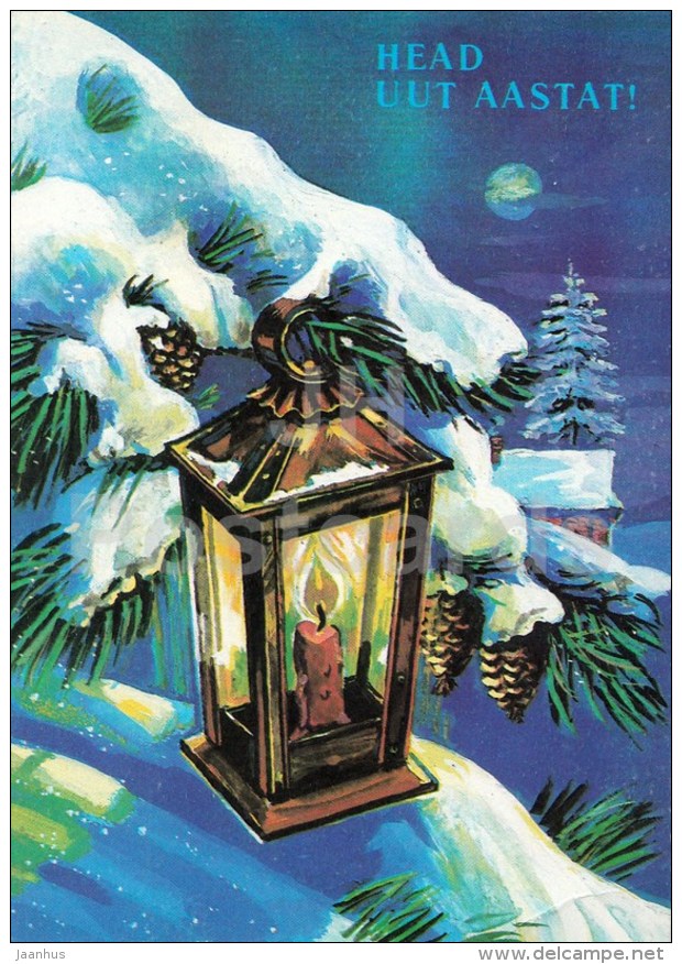New Year greeting card by I. Slonov - 4 - lantern - fit tree - postal stationery - 1991 - Estonia USSR - used