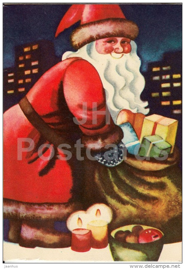 New Year Greeting Card by L. Härm - 1 - Santa Claus - gifts - Estonia - USSR - 1979 - used