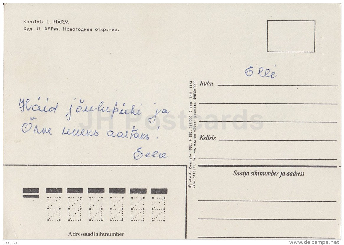 New Year Greeting card by L. Härm - Santa Claus with Gifts and Fir Tree - 1982 - Estonia USSR - used