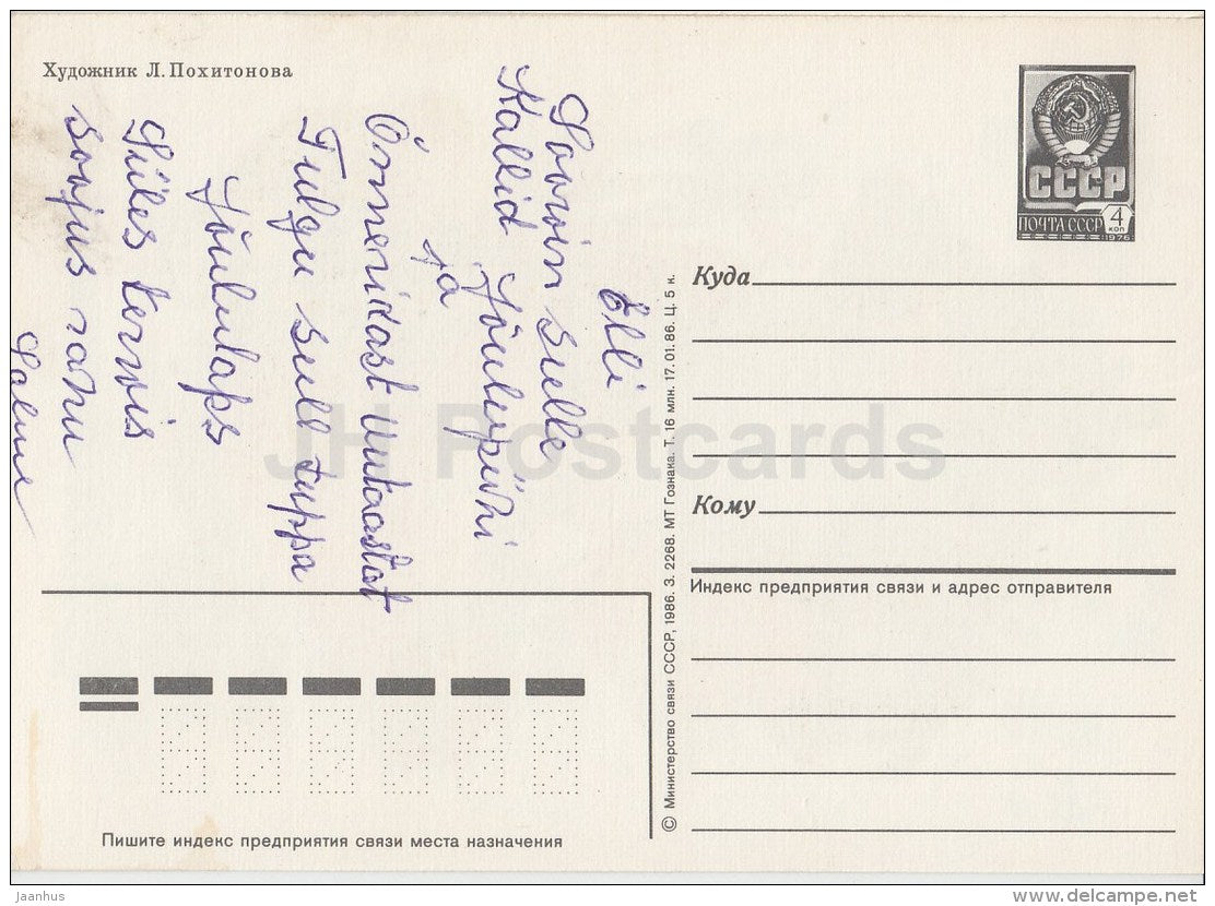 New Year Greeting Card by L. Pokhitonova - Ded Moroz - Santa Claus - clock - birds - 1986 - Russia USSR - used