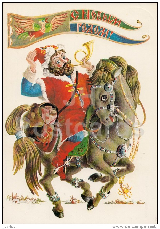 New Year greeting card by L. Pokhitonova - horseman - horse - mail - 1983 - Russia USSR - used