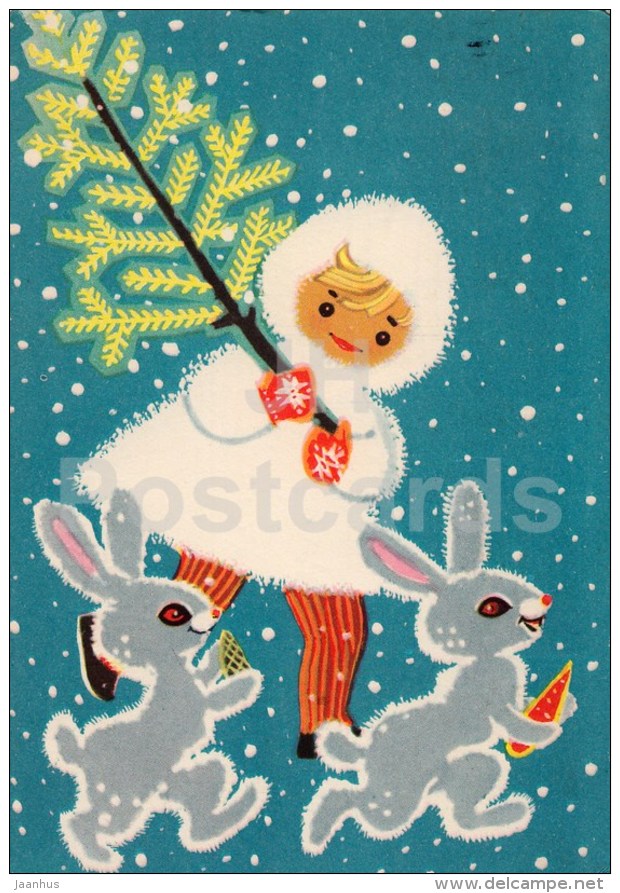 New Year Greeting card by M. Fuks - Girl - hare - carrot - tree - 1965 - Estonia USSR - used