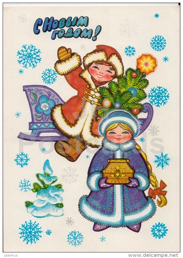 New Year greeting card by S. Komarova - boy and girl - sledge - postal stationery - 1980 - Russia USSR - unused