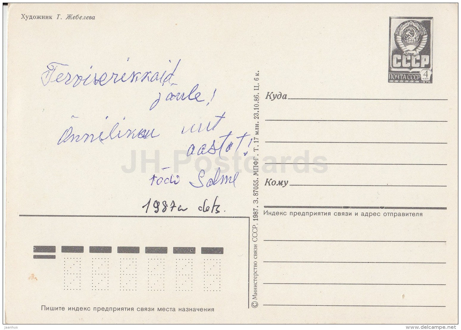 New Year Greeting Card by T. Zhebelyeva - Bear - honey - birds - 1987 - Russia USSR - used