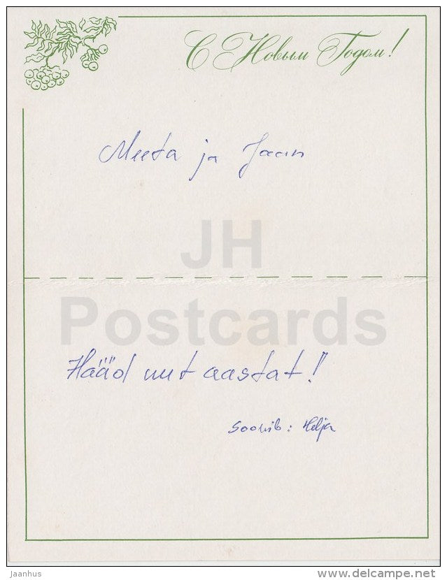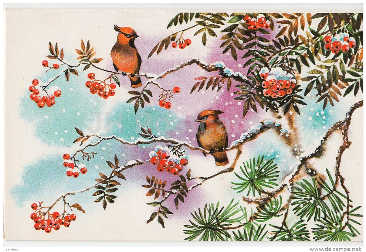 New Year Greeting Card by T. Zhebelyeva - rowan - birds - 1988 - Russia USSR - used