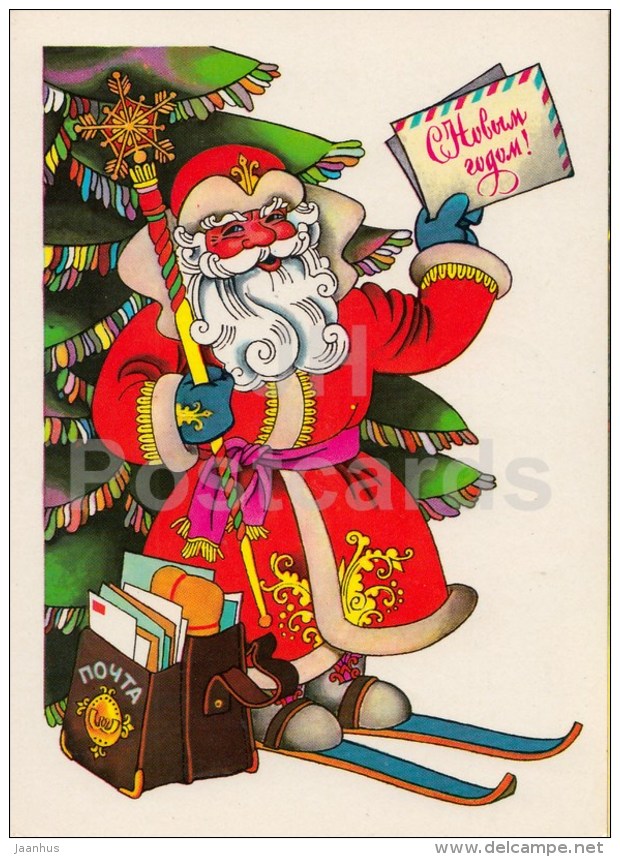 New Year greeting card by V. Beltyukov - 1 - Ded Moroz - mail - skiing - postal stationery - 1980 - Russia USSR - used