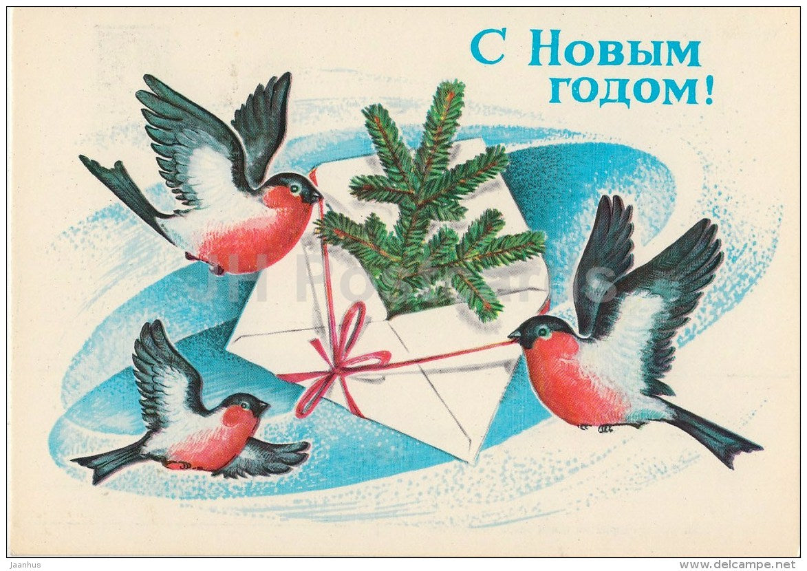 New Year greeting card by V. Khmelyev - bullfinch - birds - mail - postal stationery - AVIA - 1982 - Russia USSR - used