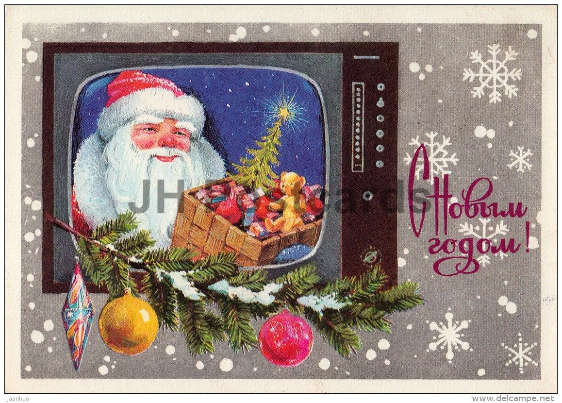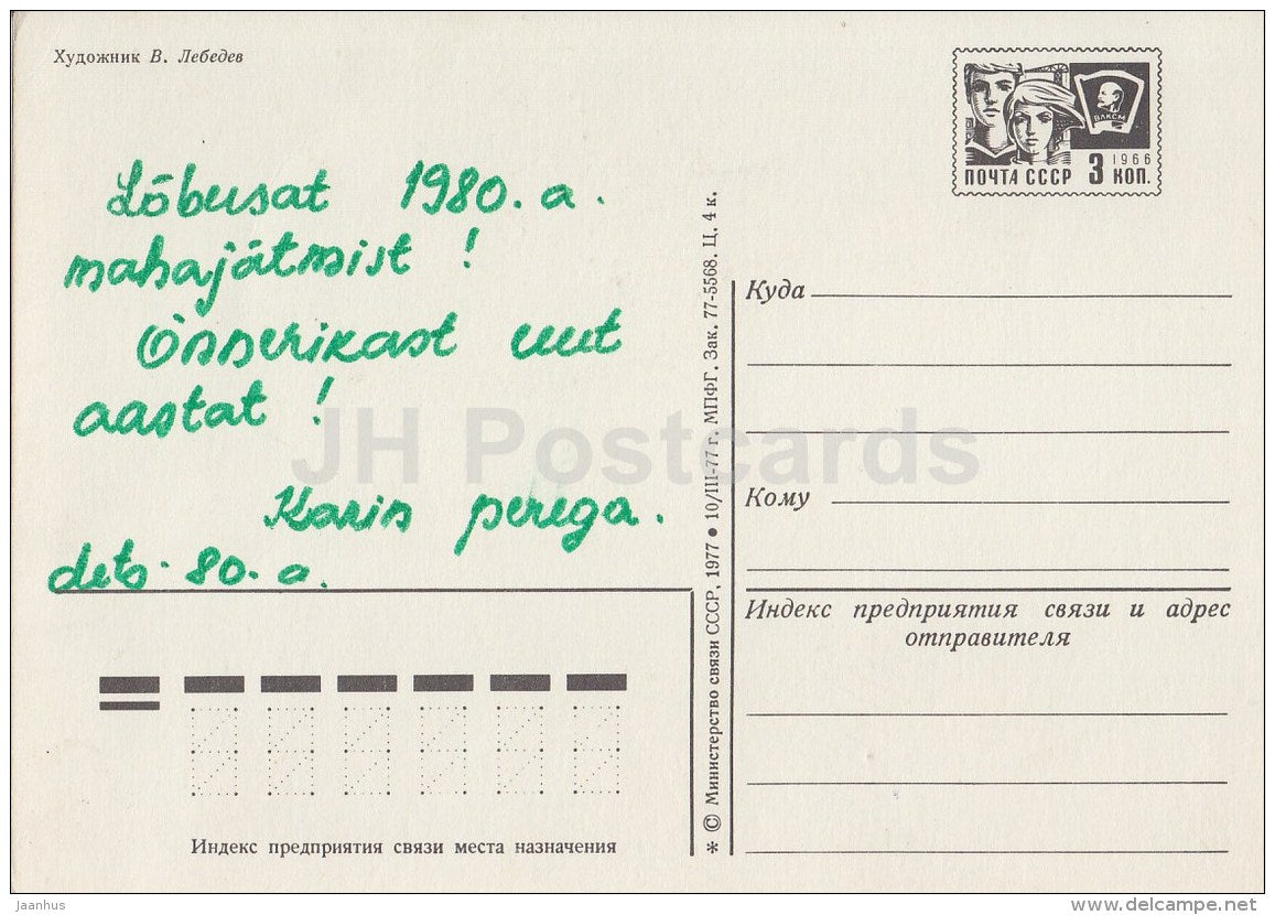New Year greeting card by V. Lebedev - 1 - Santa Claus - Ded Moroz - TV - postal stationery - 1977 - Russia USSR - used