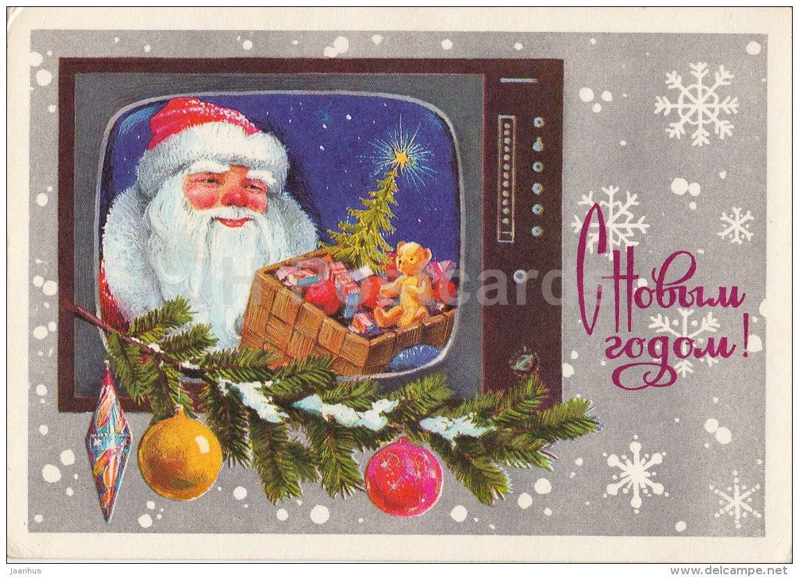 New Year greeting card by V. Lebedev - 2 - Santa Claus - Ded Moroz - TV - postal stationery - 1977 - Russia USSR - used