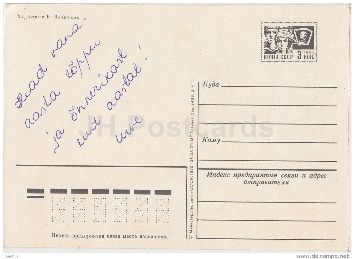 New Year greeting card by V. Vyaznikov - 2 - Ded Moroz - Snegurochka - clock - 1979 - Russia USSR - used