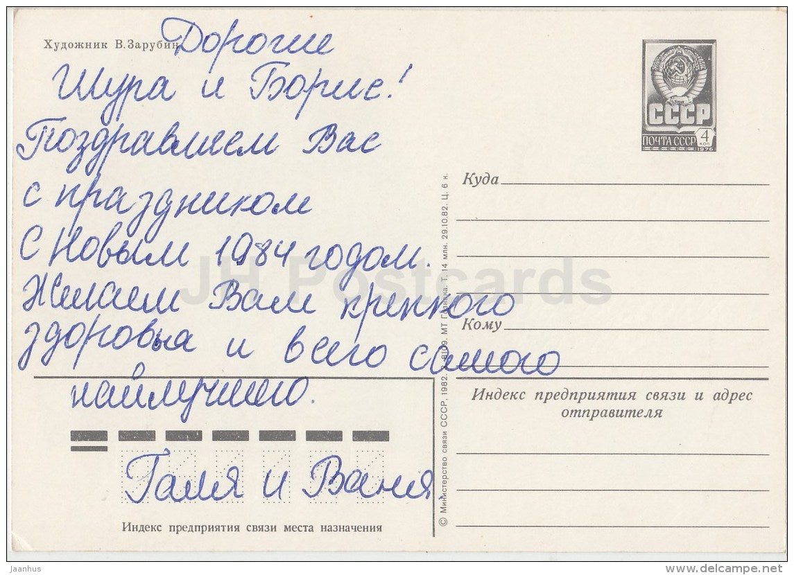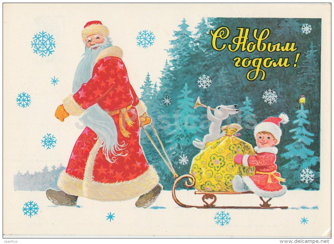 New Year greeting card by V. Zarubin - Ded Moroz - hare - boy - sledge - postal stationery - 1982 - Russia USSR - used