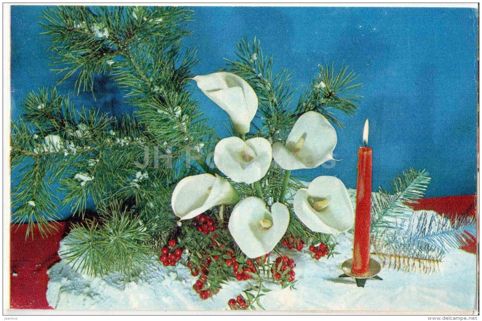 New Year greeting card - candle - flowers - 1970 - Russia USSR - unused