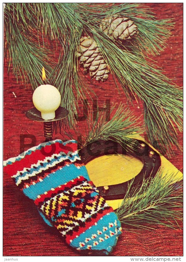 New Year Greeting card - mittens - horseshoe - 1978 - Estonia USSR - unused