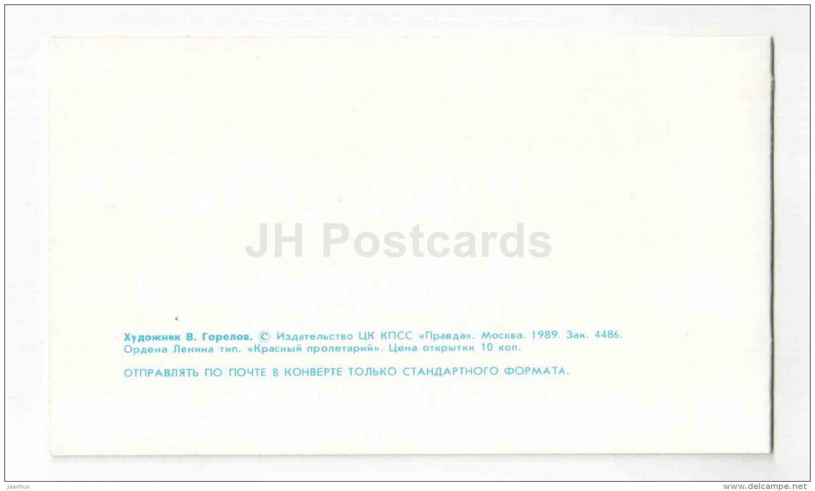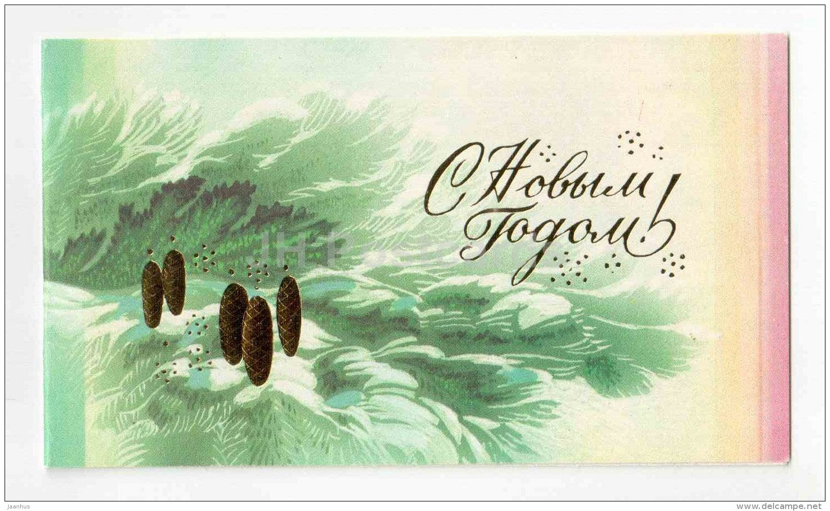 New Year mini greeting card by V. Gorelov - fir tree - cones - 1989 - Russia USSR - unused