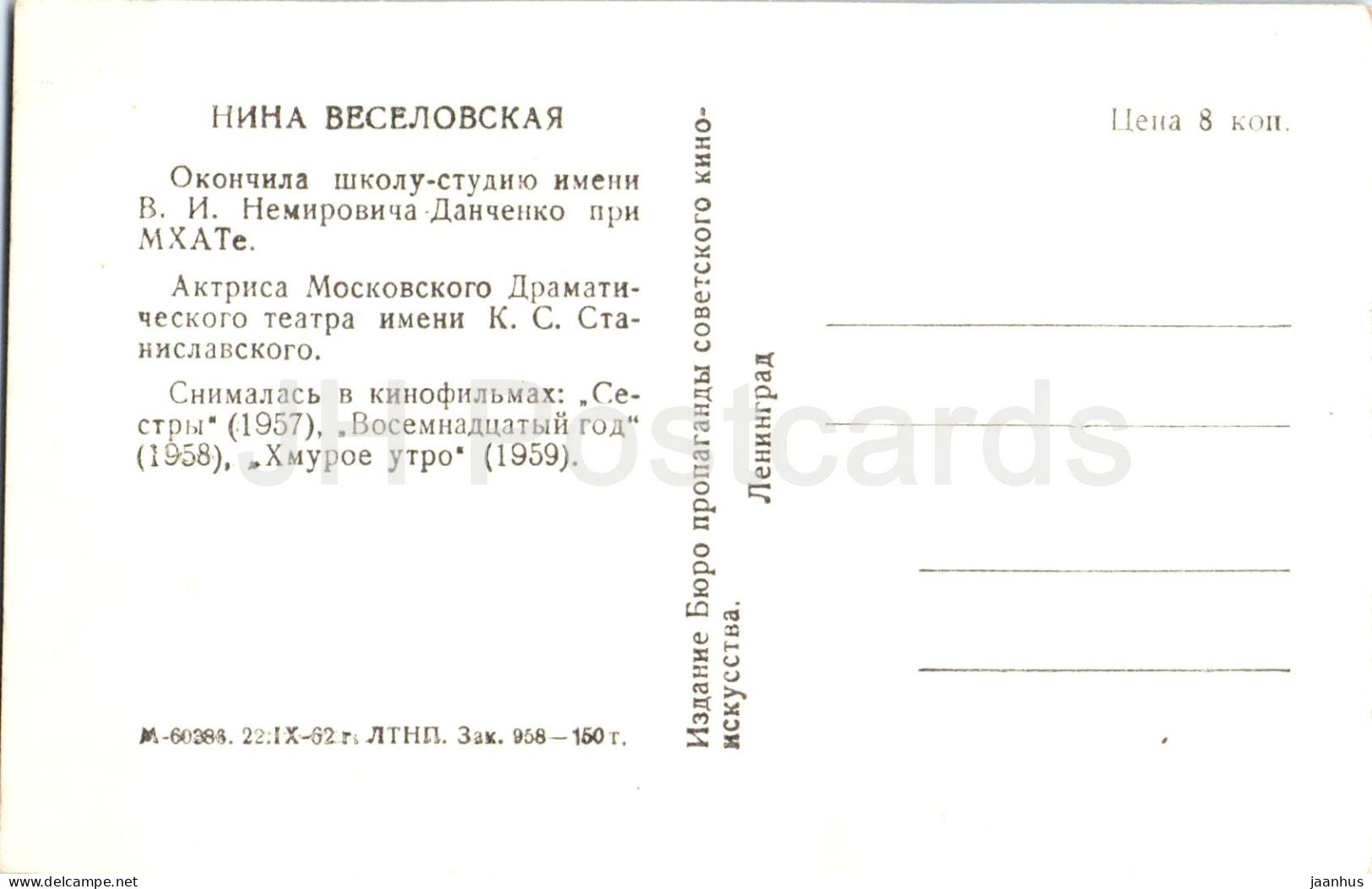 Nina Veselovskaya - Soviet - Russian movie actress - 1962 - Russia USSR - unused