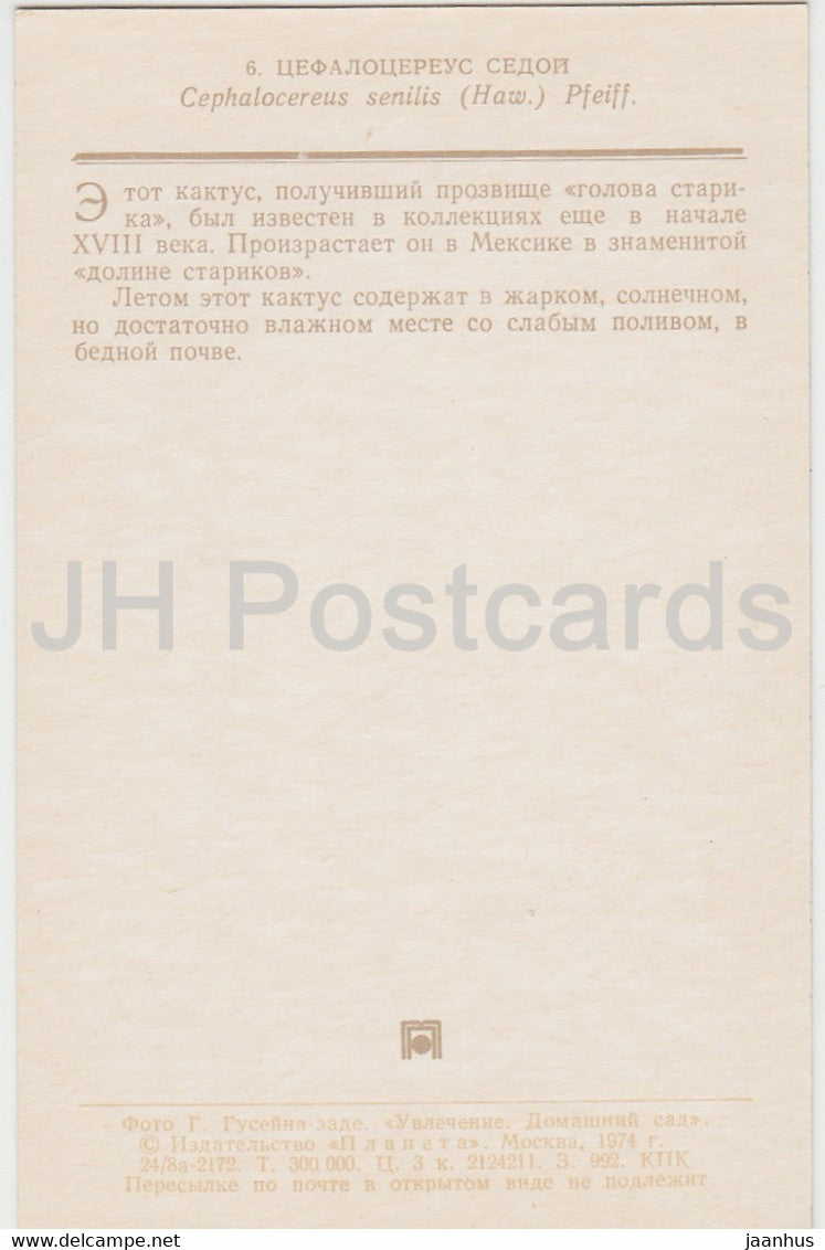 Old man cactus - Cephalocereus senilis - Cactus - flowers - 1974 - Russia USSR - unused