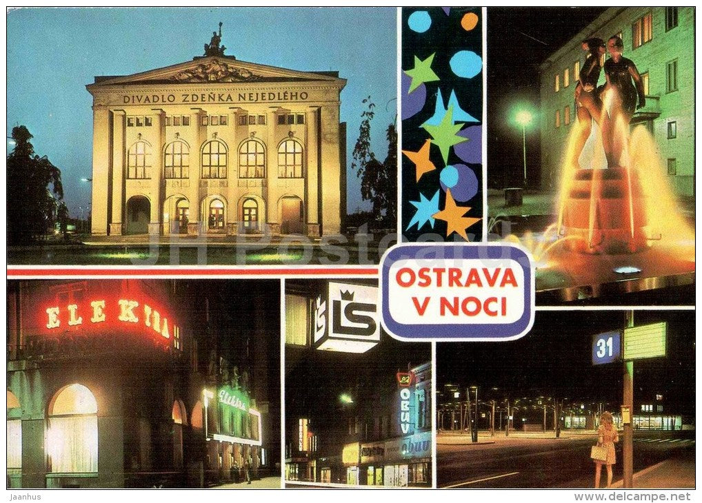 Ostrava in the Night - Zdenak Nejedleho theatre - fountain - House of Culture - Czechoslovakia - Czech - unused