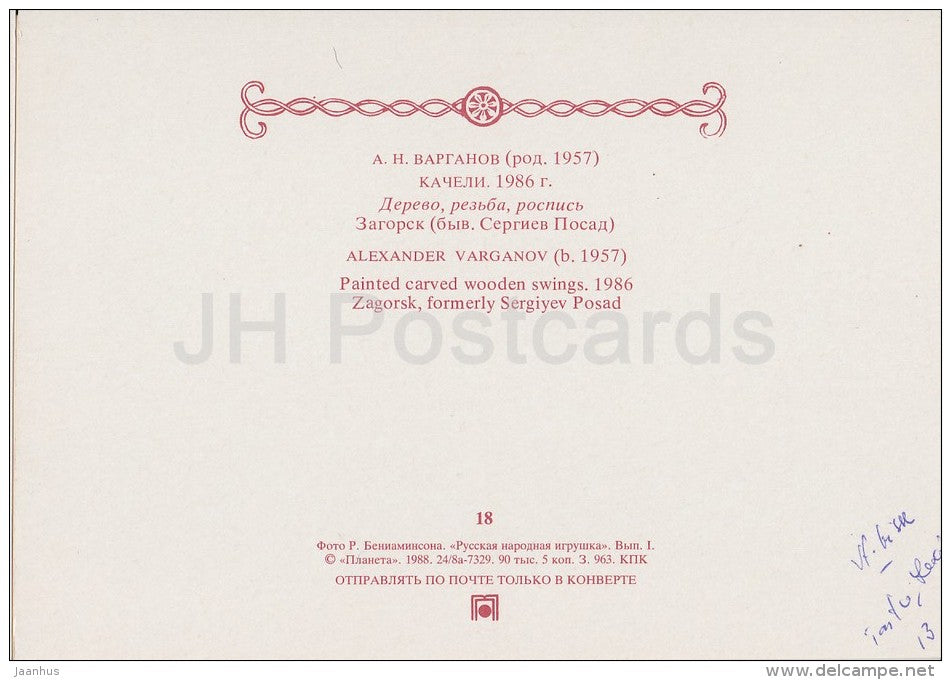 Painted Carved Wooden Swings , 1986 - Russian Folk Toy - 1988 - Russia USSR - unused